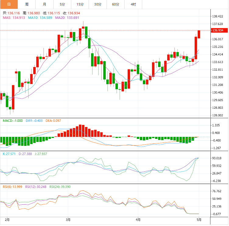 周一盘中,美元兑日元上涨至136.94,涨幅0.49%。