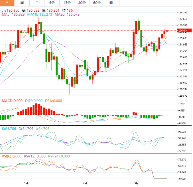 周三,美元兑日元在亚洲市场小幅回调至136.50下方后,恢复了上行之旅。尽管一季度国内生产总值(GDP)数据乐观,但由于日元未能找到强势,美元兑美元的目标是重新夺回周二的高点136.68。第一季度GDP增长0.4%,而预期为0.1%。上一季度,国内生产总值增长停滞不前。