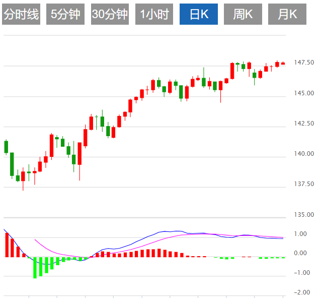 今日预期交易区间在147.00支撑位和148.70阻力位之间