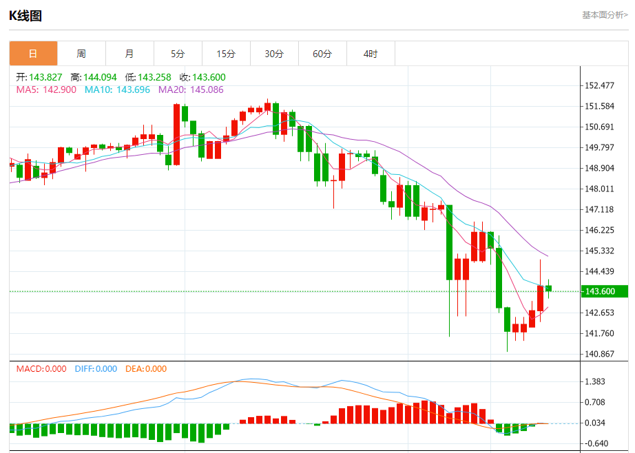 周三纽盘,美元兑日元交投于143.611,跌幅为0.16%。