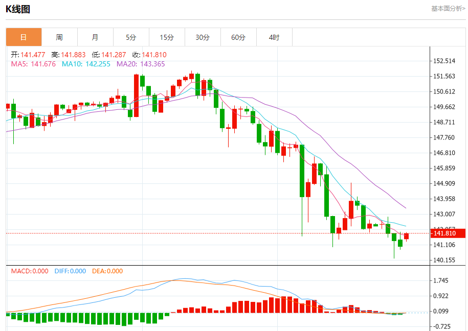 今日周二,截止目前美元兑日元报141.828,上涨0.57%。