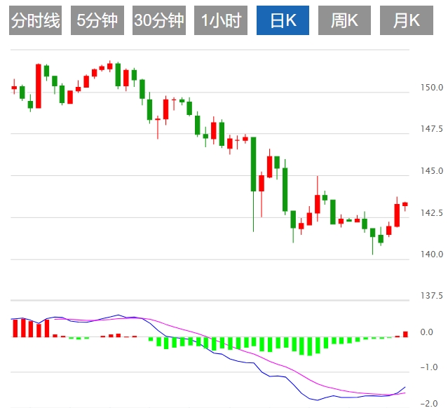 日K线图显示,该货币对从200日均线略高于143.00直接进入技术阻力位,该货币对从11月峰值151.91下跌7.5%的峰谷跌幅保持不变。