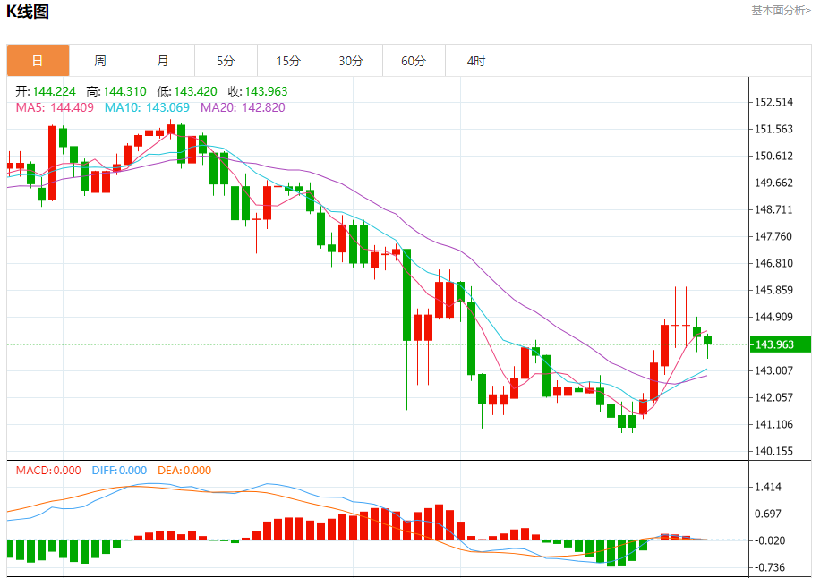 周二纽盘,美元兑日元交投于143.974,跌幅为0.18%。