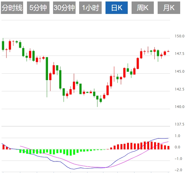 今天的预期交易区间在147.50支撑位和149.00阻力位之间