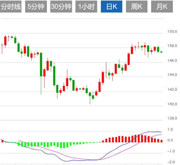 今天的预期交易区间在146.50支撑位和148.00阻力位之间