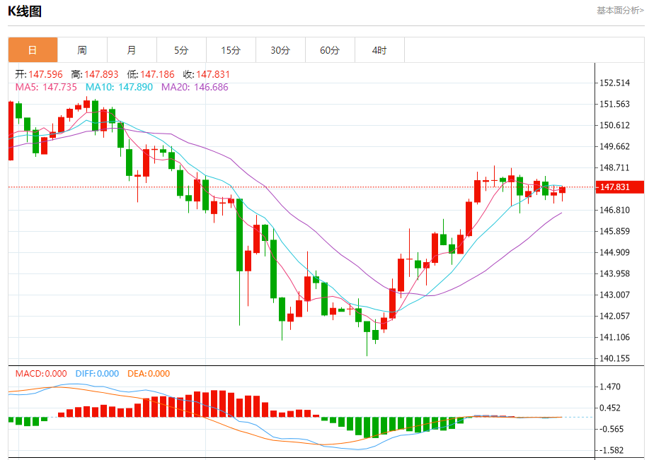 周三纽盘,美元兑日元交投于147.834,涨幅为0.16%。