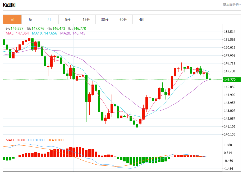 今日周四,截止目前美元兑日元报146.858,下跌0.01%。