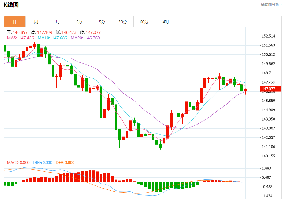 周四纽盘,美元兑日元交投于147.086,涨幅为0.15%。