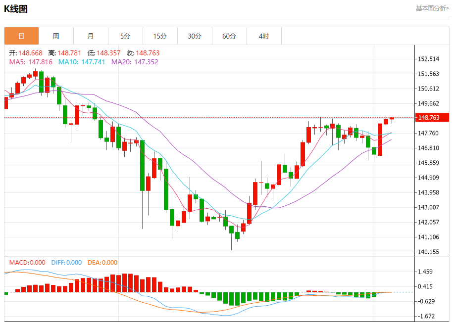 今天的预期交易范围在148.00支撑位和149.50阻力位之间