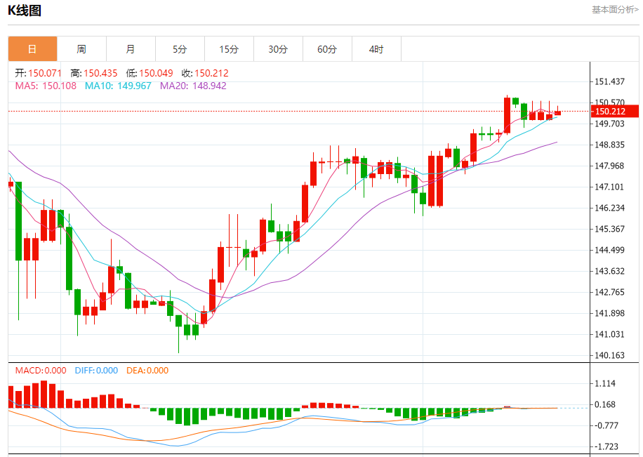 今日周二,截止目前美元兑日元报150.231,上涨0.09%。