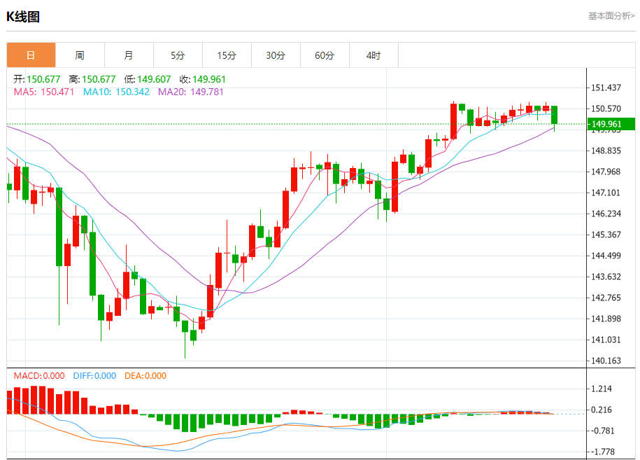 今日周四,截止目前美元兑日元报149.966,下跌0.49%。
