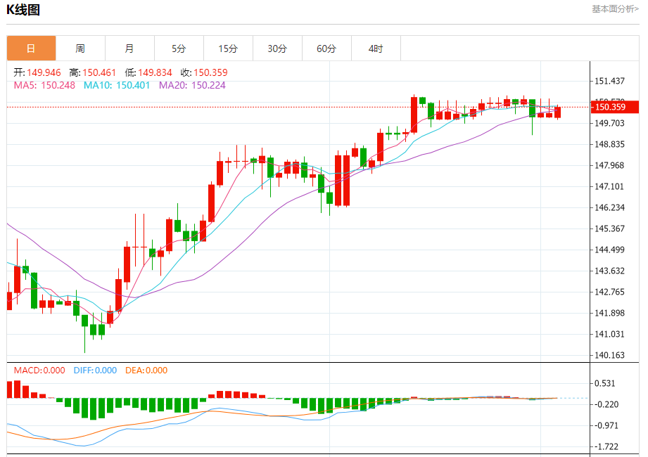 周一纽盘,美元兑日元交投于150.367,涨幅为0.16%。