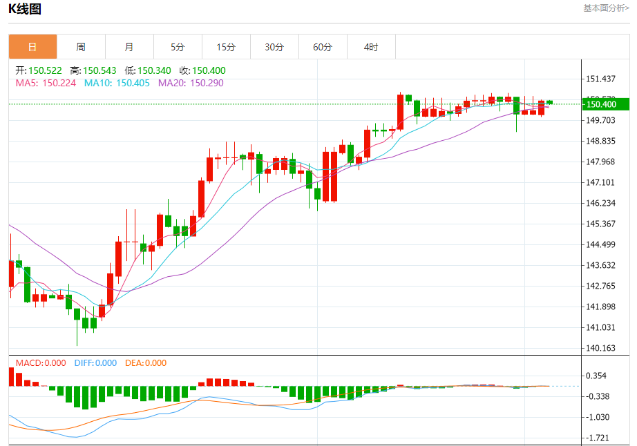 今日周二,截止目前美元兑日元报150.403,下跌0.08%。