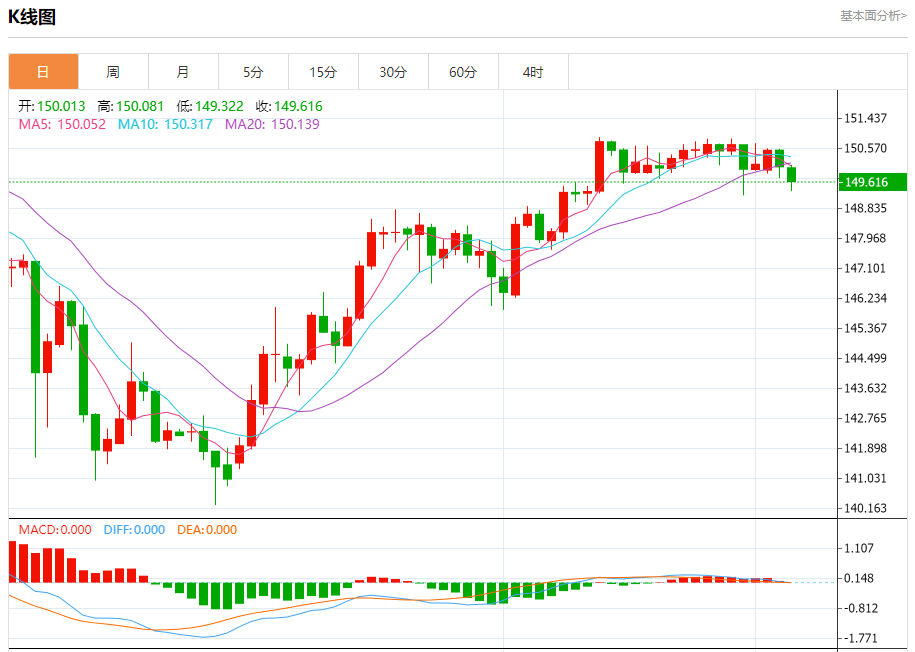 今天的预期交易范围在149.20支撑位和150.80阻力位之间