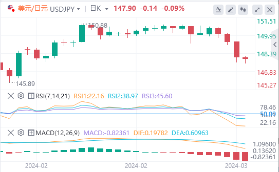 3月8日,周五欧市盘前,美元/日元跌至147.81,尽管日本工资增长,家庭支出仍下降。日本退出负利率的押注进入敏感时刻,投资者紧盯日本央行的言论。市场分析指出,美元/日元发出近期看跌、长期看涨的价格信号,空头瞄准146进发。