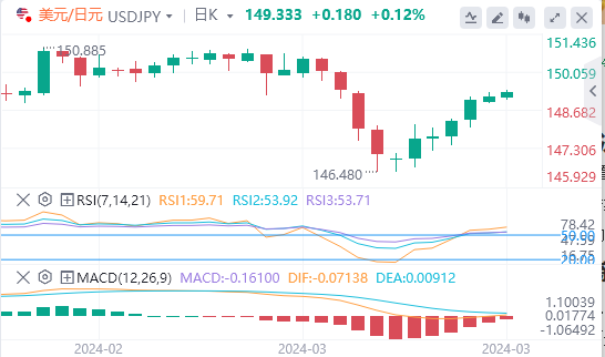 美元/日元周一上涨0.10%。继上周五上涨0.47%后,美元/日元收于149.144。美元/日元升至149.332的高点,然后跌至周一盘中低点148.905。