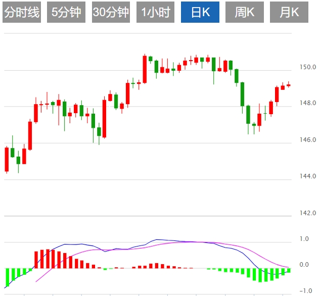 今天的预期交易区间在148.60支撑位和150.00阻力位之间