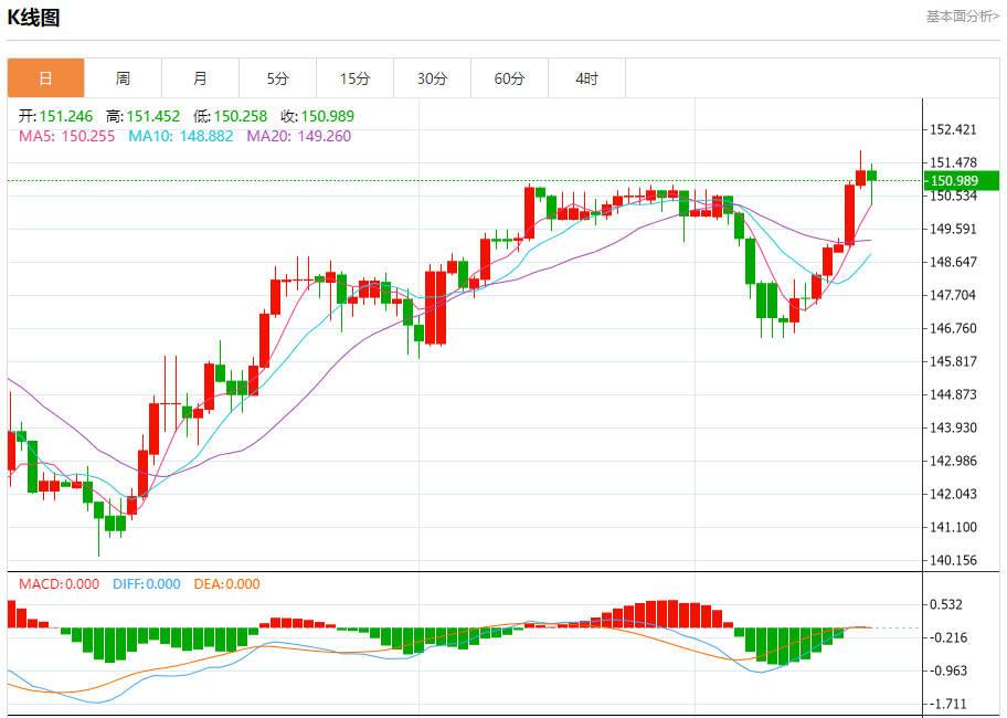 今日周四,截止目前美元兑日元报150.999,下跌0.17%。