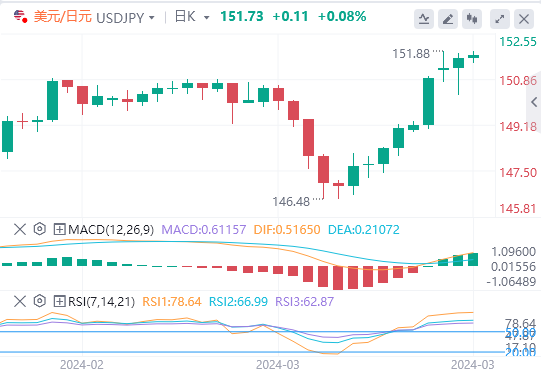美元/日元周四上涨0.23%。继周三上涨0.27%之后,美元/日元收于151.604。美元/日元跌至150.261的低点,随后升至周四的高点151.753。