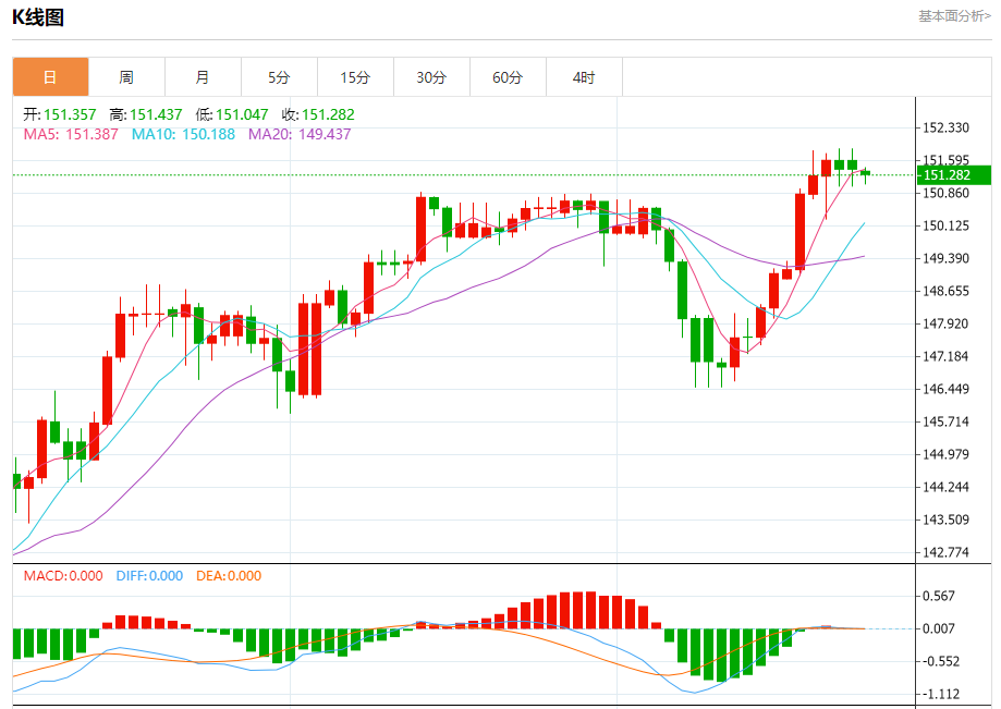 今天的预期交易范围在150.50支撑位和151.80阻力位之间