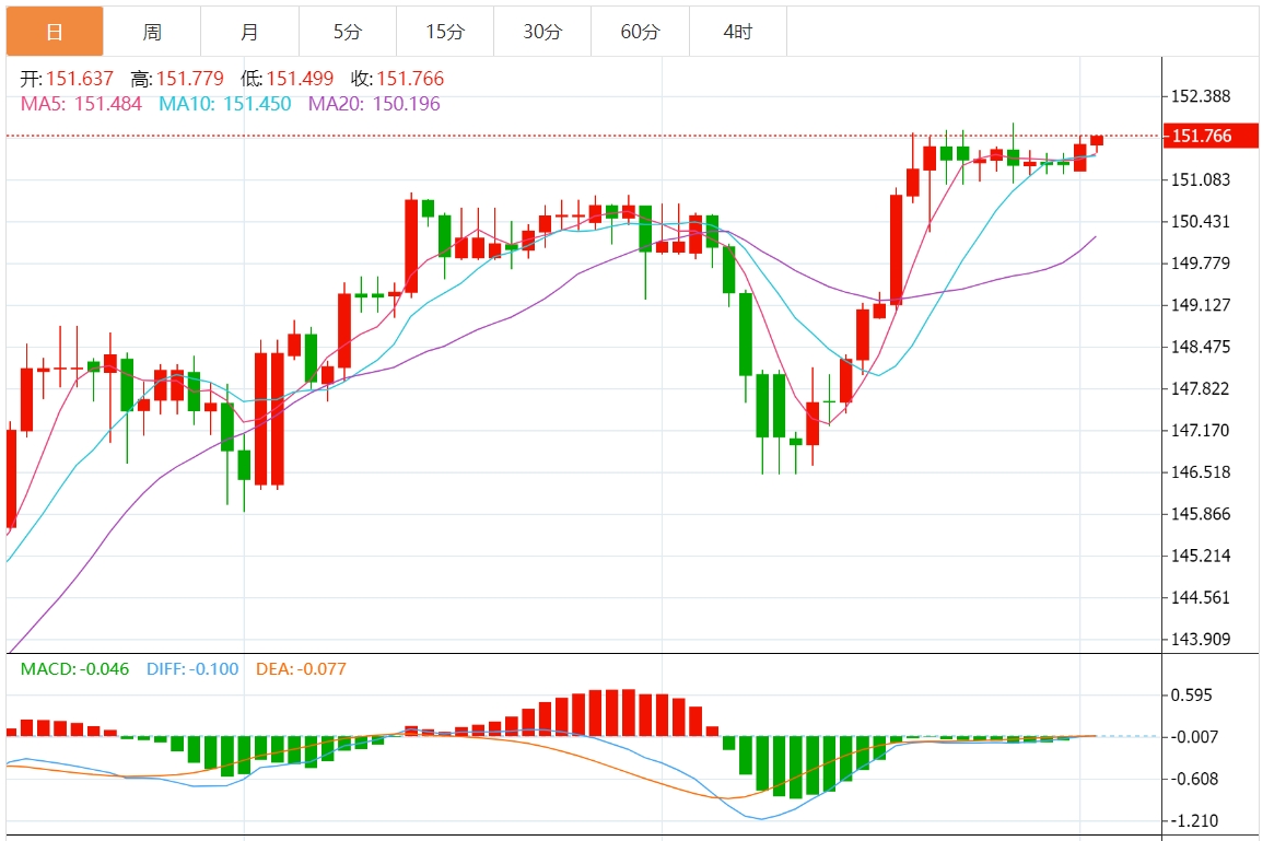 美元/日元日线图显示,美元/日元在 151.00/152.00 区域附近盘整,152.00 标志作为第一阻力位的干预威胁正在增强。 突破152.00点将面临153.00点心理关卡,然后是155.00点。