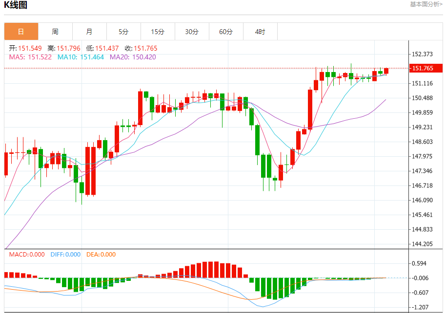 周三纽盘,美元兑日元交投于151.774,涨幅为0.14%。