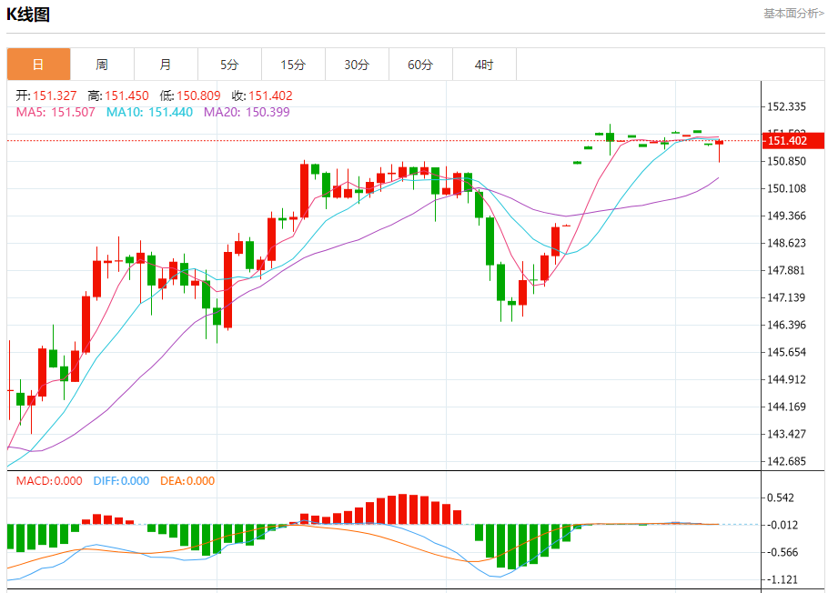 今日周五,截止目前美元兑日元报151.414,上涨0.05%。