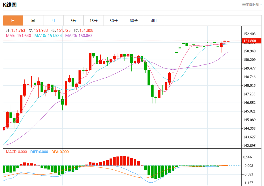 今日周二,截止目前美元兑日元报151.815,上涨0.02%。