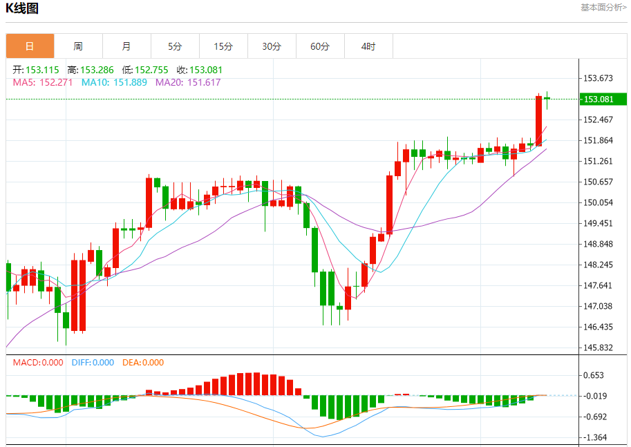周四纽盘,美元兑日元交投于153.087,跌幅为0.05%。