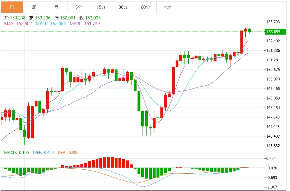 今天的预期交易区间在152.40支撑和154.00阻力之间。