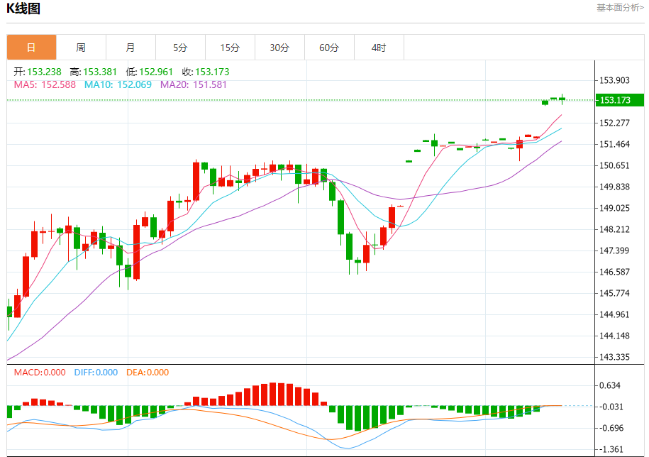 美元兑日元汇率在前几个交易日一直横盘整理,突破153.00关口。