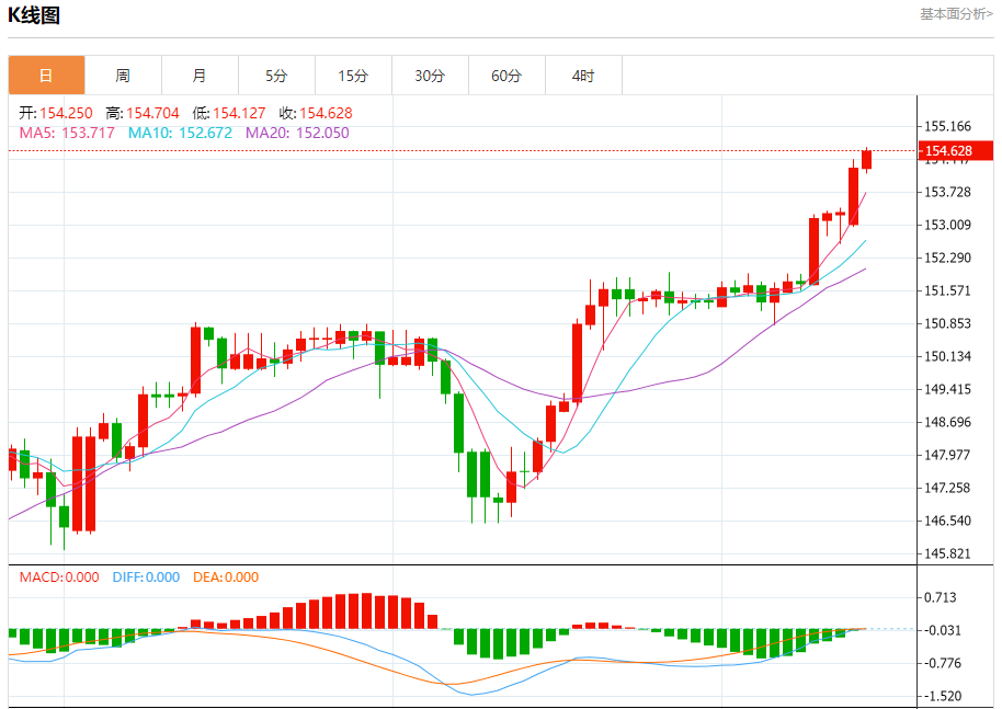 今日周二,截止目前美元兑日元报154.631,上涨0.24%。