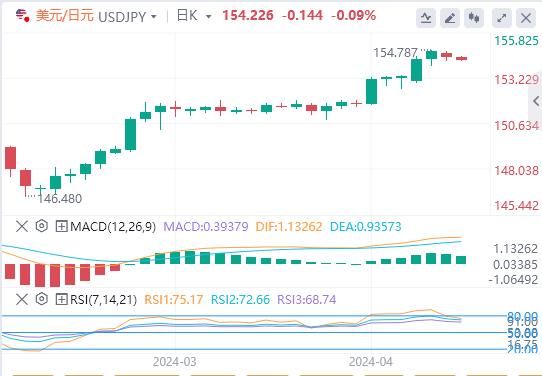 美元/日元轻松徘徊在50日和200日均线上方,确认了看涨价格信号。如果美元/日元从4月16日的高点154.787突破,多头将突破155关口。