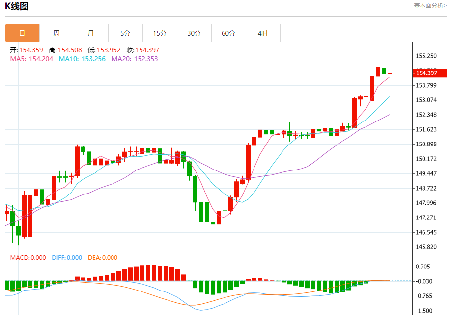 周四纽盘,美元兑日元交投于154.408,涨幅为0.01%。