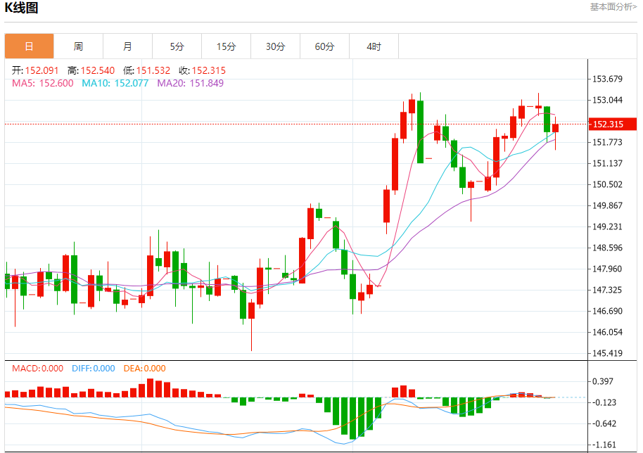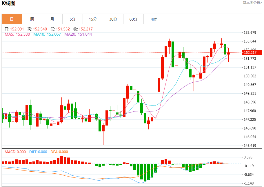 今日周二,截止目前美元兑日元报152.044,下跌0.55%。