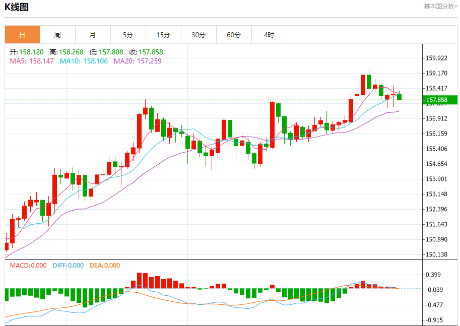 今日周三,截止目前美元兑日元报157.870,下跌0.18%。