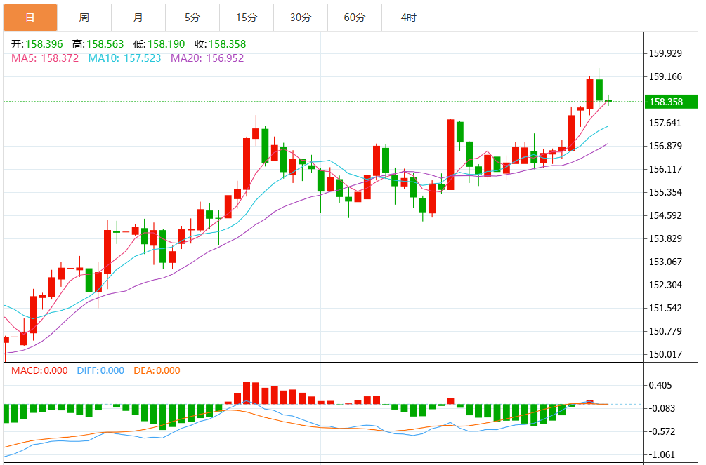 周一亚市时段,美元兑日元冲高回落,一度上涨0.3%触及157.65,为逾两周新高,随后转跌,目前交投于156.80附近,跌幅约0.25%。