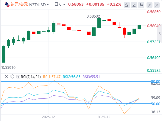 1月6日,纽元/美元连续第三个交易日上涨,周二欧洲早盘交易约0.5810。在对更广泛地缘政治升级担忧缓解的背景下,这对风险敏感的货币对有所回升。