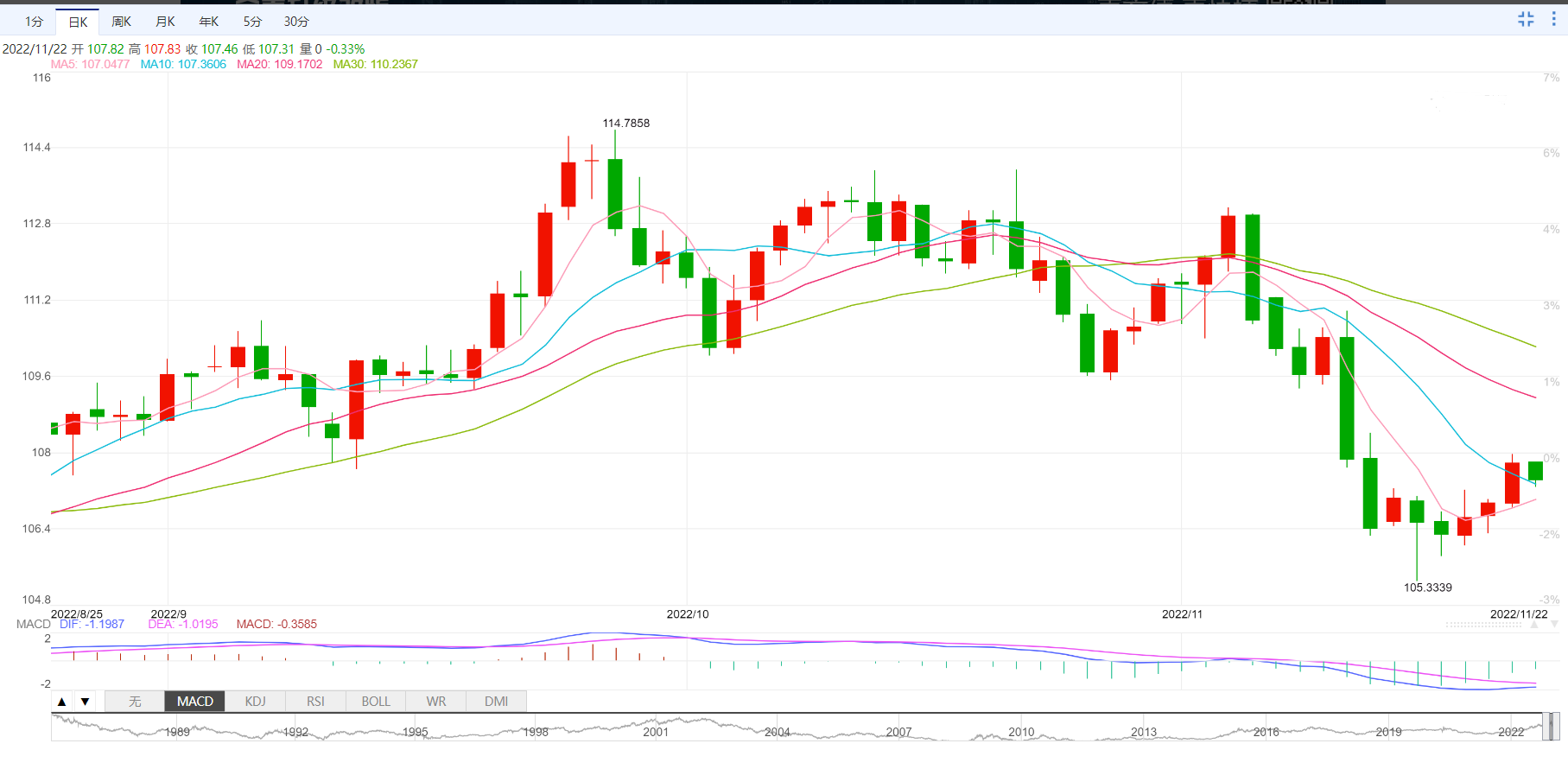 目前,美元指数在107.35处下跌了0.39%,如果跌破105.34(11月15日的月均线最低值),将有可能达到105.17(200日移动平均线)和104.63(8月10日的月均线最低值)。