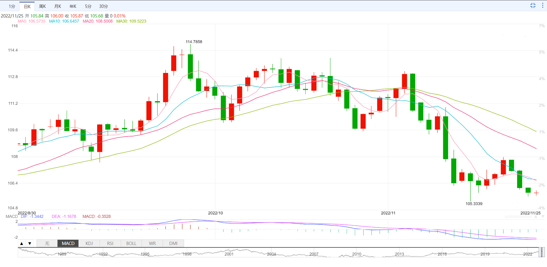 相反,如果突破105.34(11月15日),则有可能突破105.31(200日移动平均线)和104.63(8月10日)。