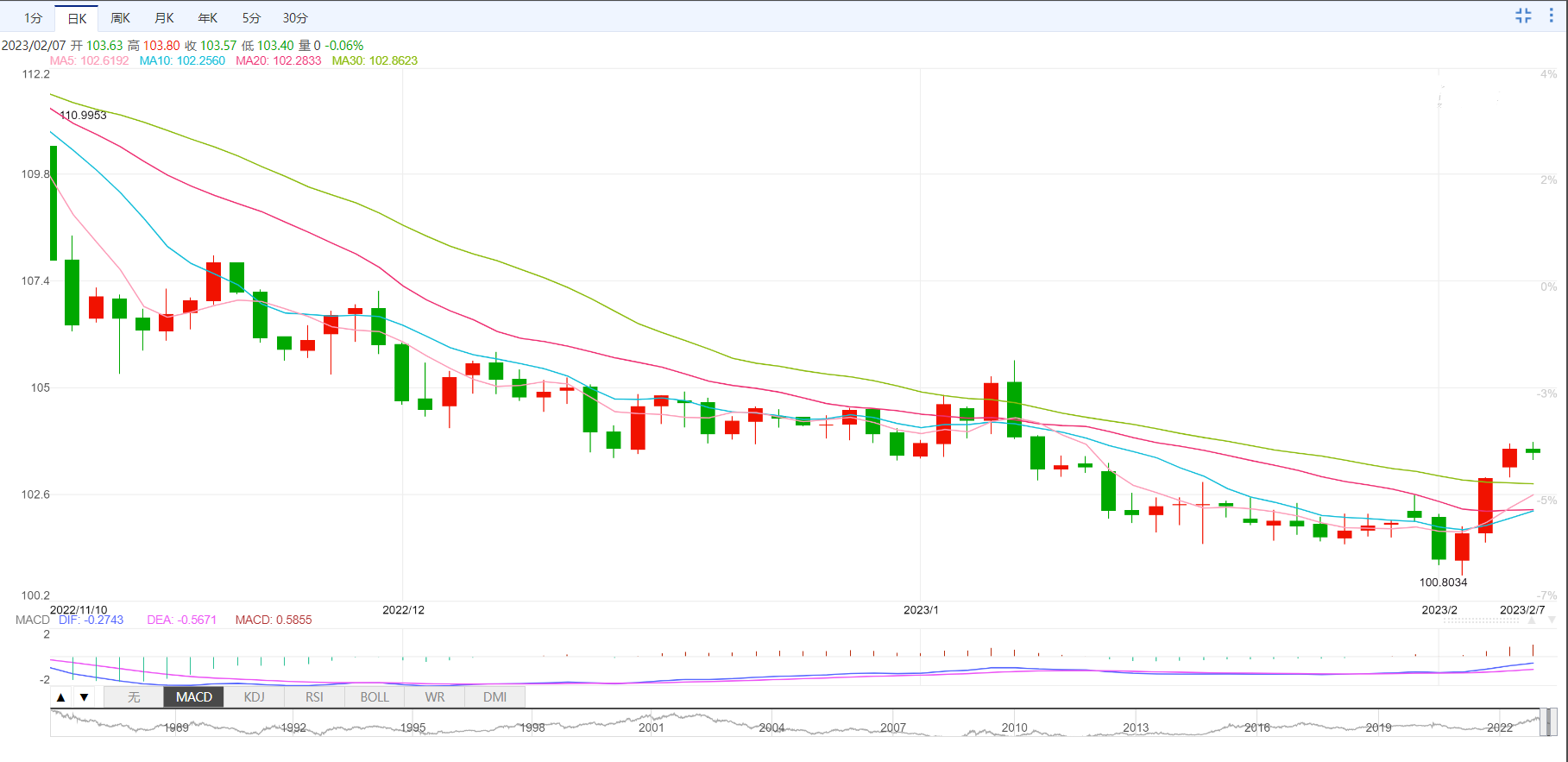 上行方向,下一个阻力出现在103.76(2月6日的月度最高价),其次是105.63(1月6日的2023年最高价),然后是106.45(200日移动均线)。
