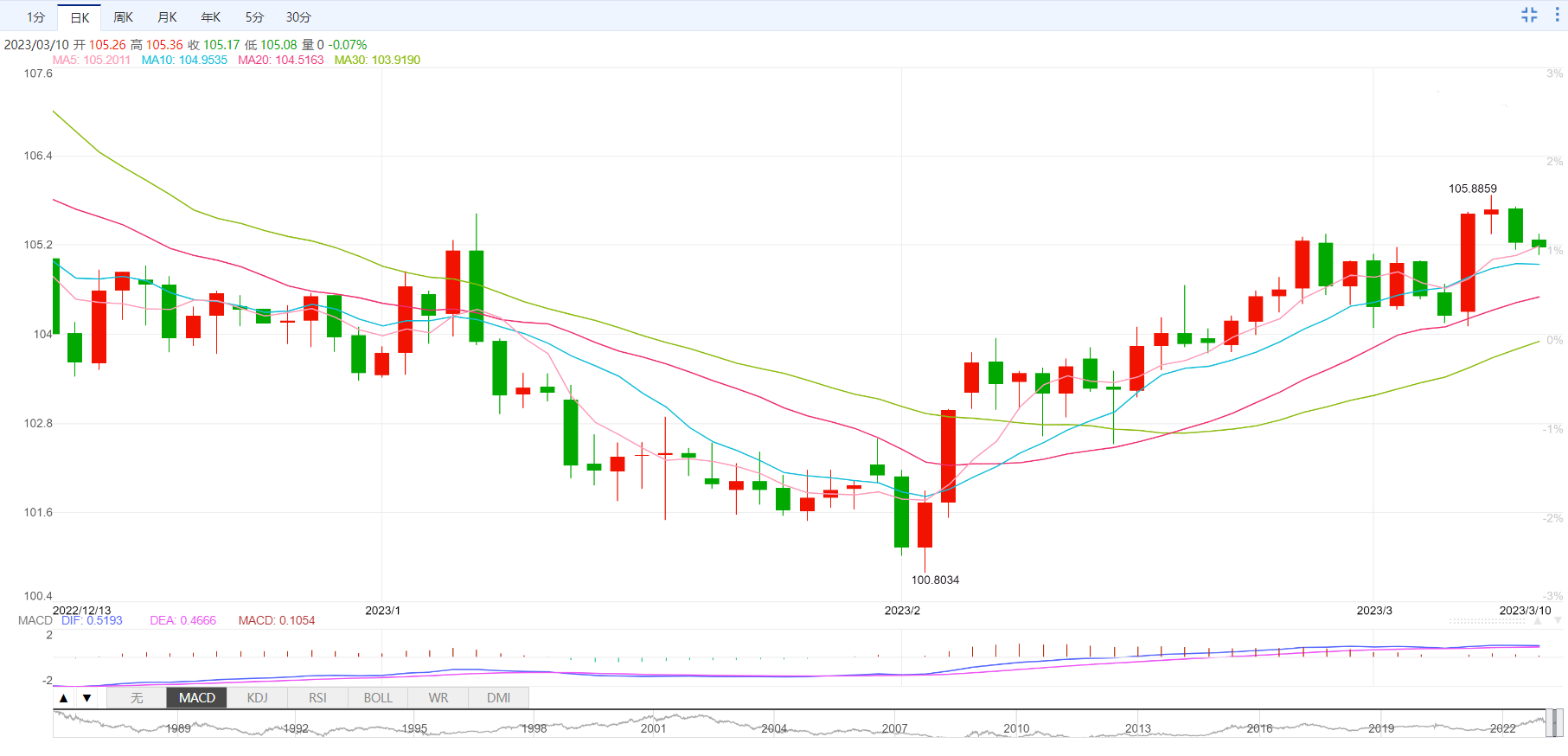现在,美元指数回落0.04%,至105.23点,跌破104.09点(3月1日的周低位)将打开103.53点(55日移动均线)的大门,最终达到102.58点(2月14日的周低位)。