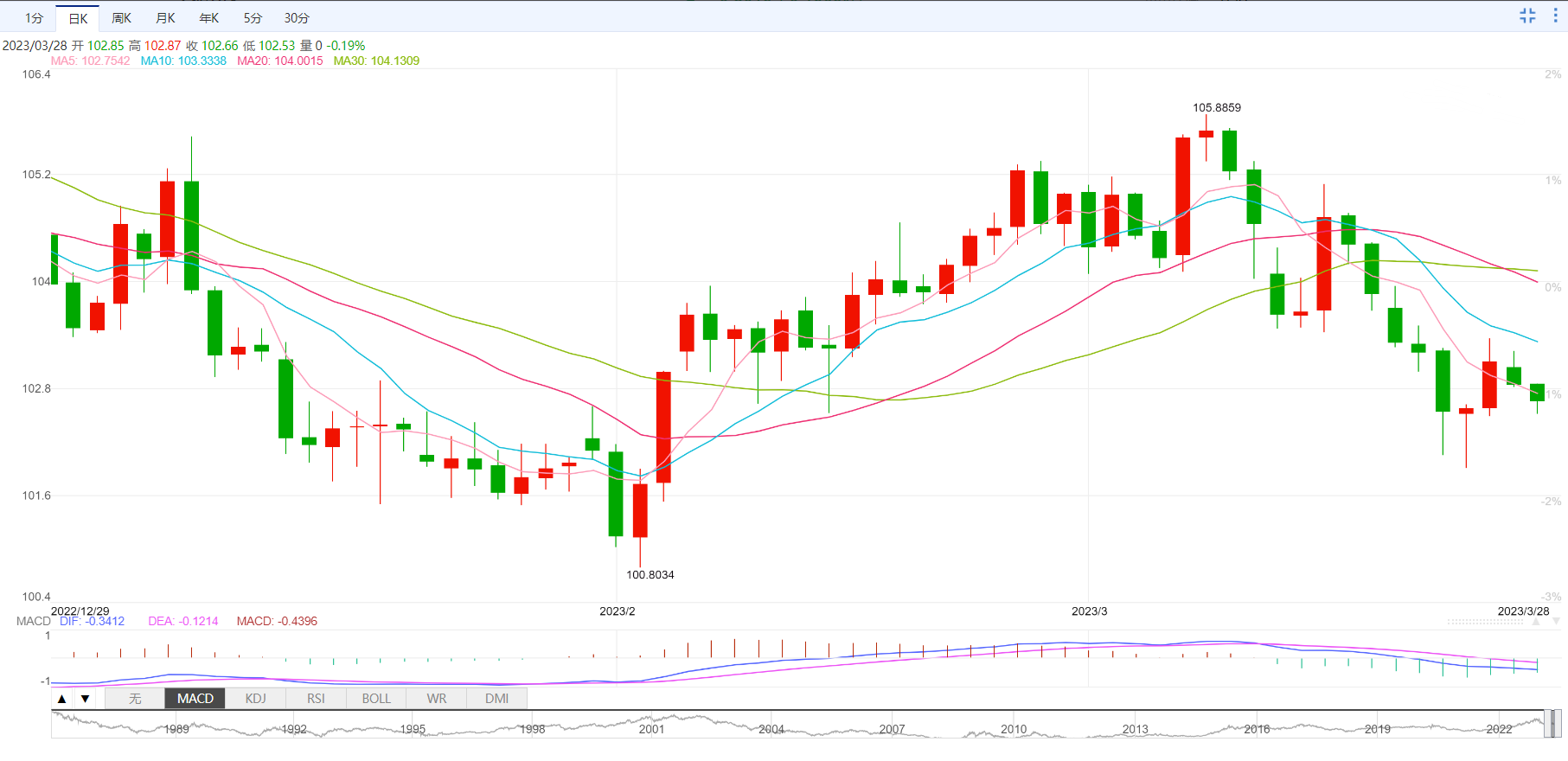 另一方面,下一个障碍出现在103.37(55天移动均线),然后是104.23(100天移动均线),然后是105.88(2023年3月8日的高点)。