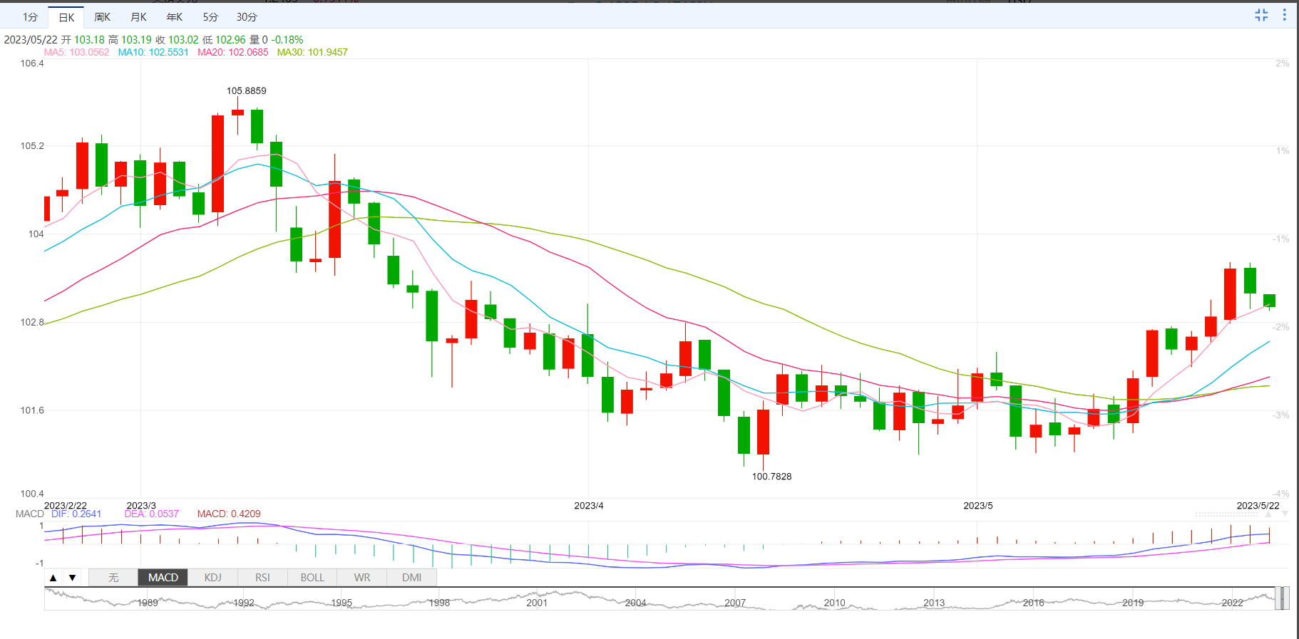 美元指数在日内底部103.00附近保持较低的位置,在周一早些时候对美国债务上限谈判和美联储(Fed)的悲观担忧中,美元指数保持了周五从多日高点的回落。如此一来,美元兑六种主要货币的指标也反映了市场对本周重要数据/事件的准备情况。