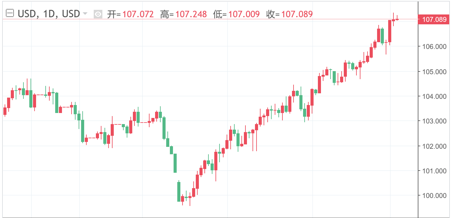 各周期的美债收益率进一步上行且风险偏好温和改善的环境下,美元指数似乎已进入盘整,整理于2023年高点附近,站上107.00关口。