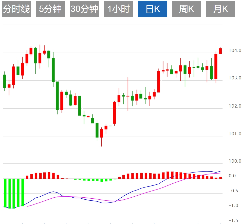 周一亚盘,美元指数周初窄幅震荡,收周三美联储决议令其巨震超100点,上周四因市场押注5月降息幅度更大而受伤,一度触及103关口,上周五在强势非农的提振下大爆发,彻底扭转周线走势,日内涨超近百点,最高触及104.047水平,为7周来最高水平,当周实现连续第5周上涨。