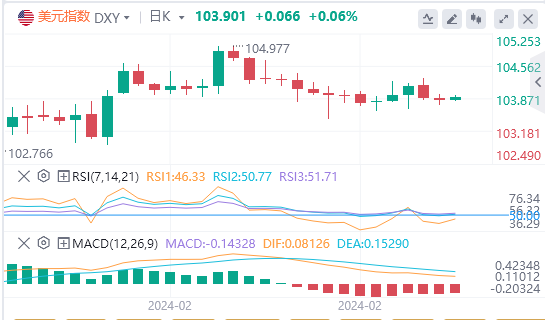 美元指数小幅上涨至103.925,上涨0.09%。这一走势使其位于103.82的枢轴点上方,暗示了看涨情绪。它面临阻力位104.24、104.44和104.69,可能会挑战进一步的上涨。不利的一面是,支撑位在103.60、103.43和103.16,为潜在的回调提供缓冲。50天和200天指数移动平均线分别位于103.943和103.818,只要该指数保持在枢轴上方,就会支持看涨趋势。这表明在当前的市场环境下,美元的前景持谨慎乐观态度。
