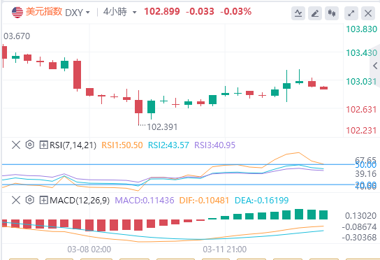 3月13日,周三亚市盘中,美元指数徘徊在102.899附近。