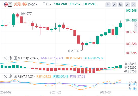 在本周五上午创下3月份新高后,DXY指数正向2月份的高点进发。上行方面,104.96仍是第一道关口。一旦突破104.96点,2月份的高点104.97点就会发挥作用,然后是105.00点区域,105.12点是第一阻力位。