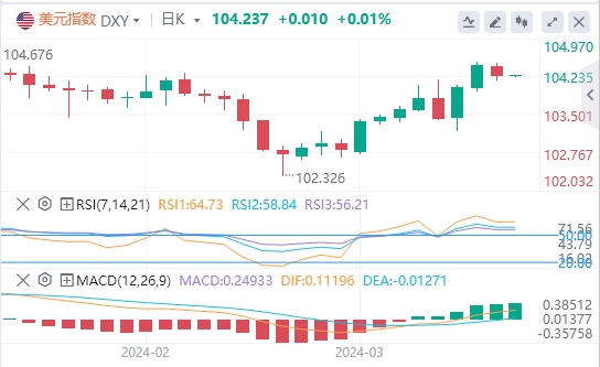 3月26日,周二亚市早盘,美元指数回落至104.24横摆附近,黄金回升至2173美元,中国央行将人民币中间价升值,产生多米诺骨牌效应,使美元处于不利地位。俄罗斯导弹进入波兰领空后,俄罗斯驻波兰大使无视波兰外交部的传唤。联合国决议要求加沙停火后,以色列取消美国访问行程。